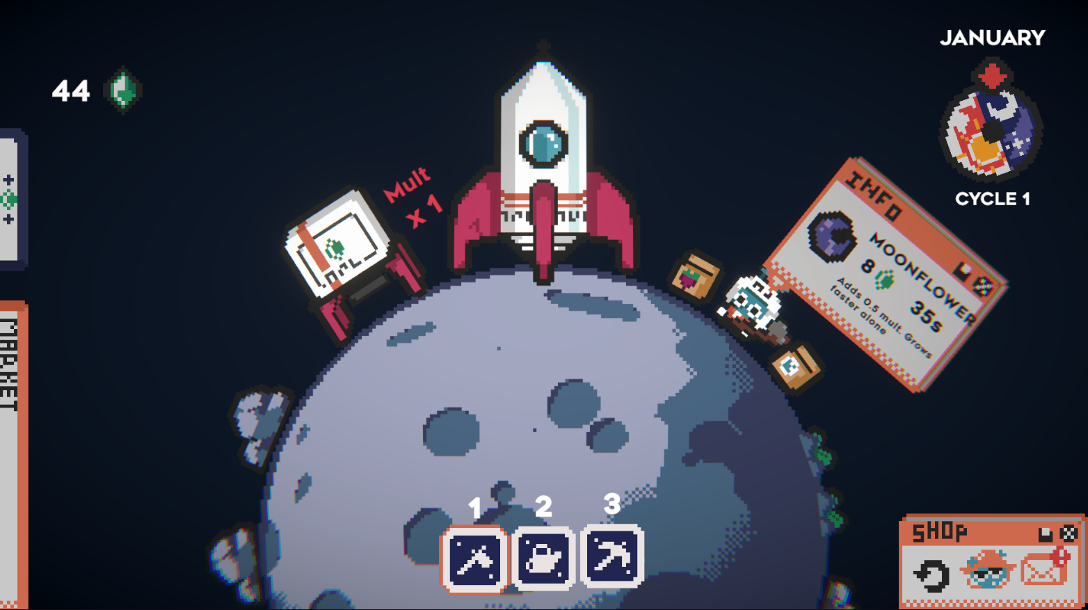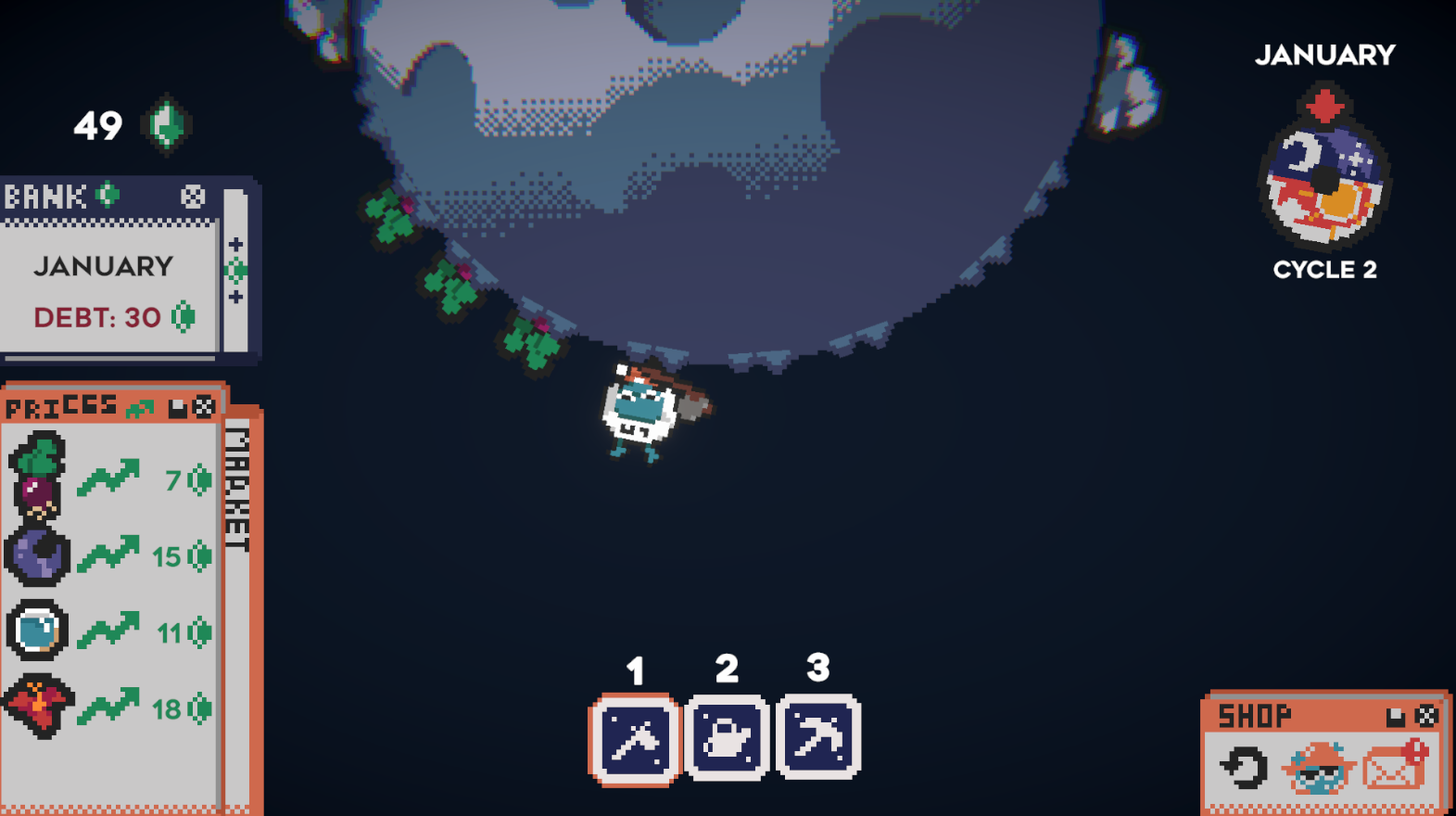 A space farming roguelike where you must plant and sell your crops to be able to pay your monthly debts.