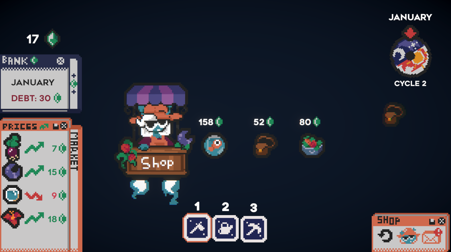 Every month, your debt goes up. Buy crazy items to increase the value of your crops and survive until December.